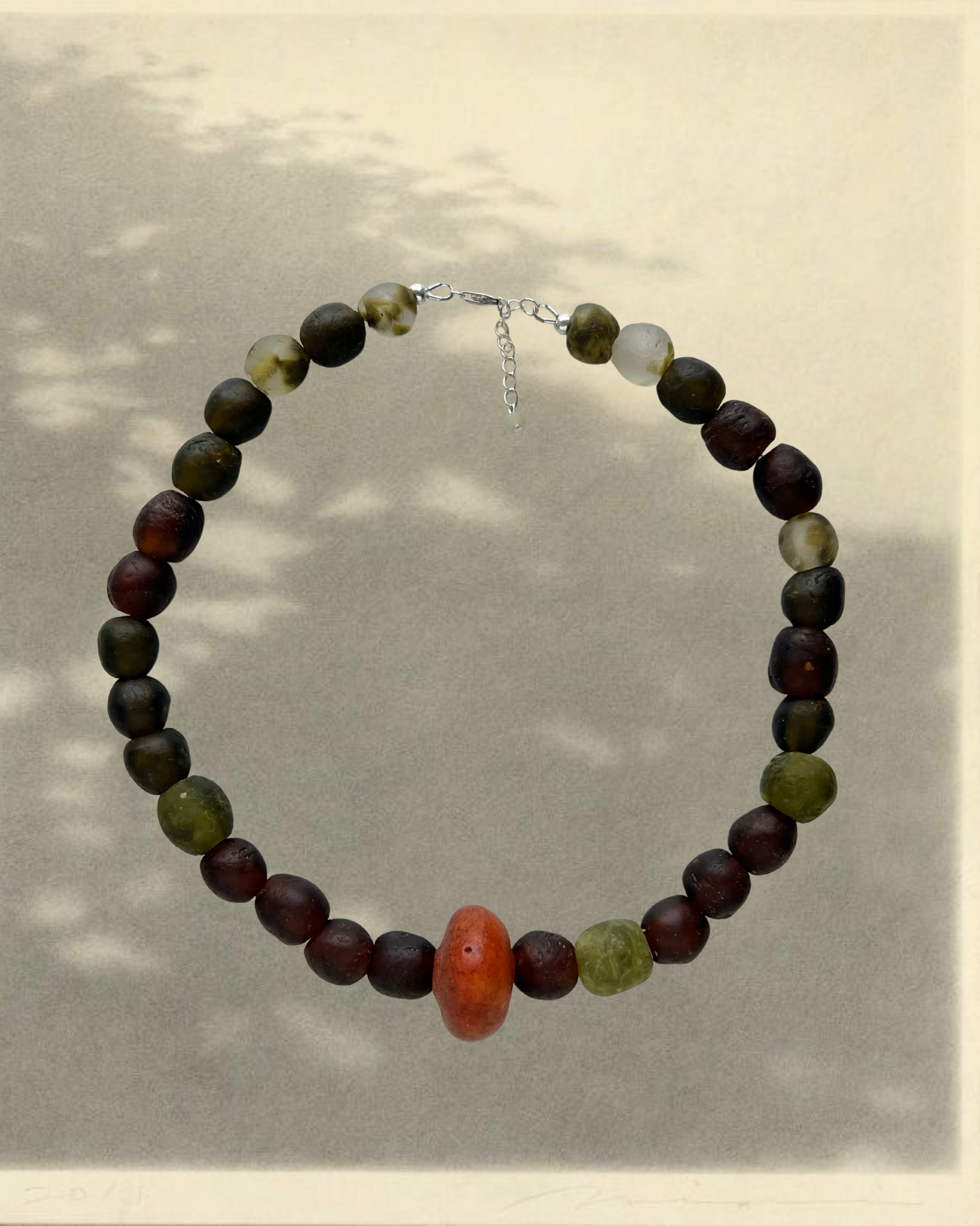 A collection of beads made from recycled glass, framing a vintage sand cast trading bead from West Africa, strung on a strong nylon coated stainless steel wire, finished with sterling silver hardware.