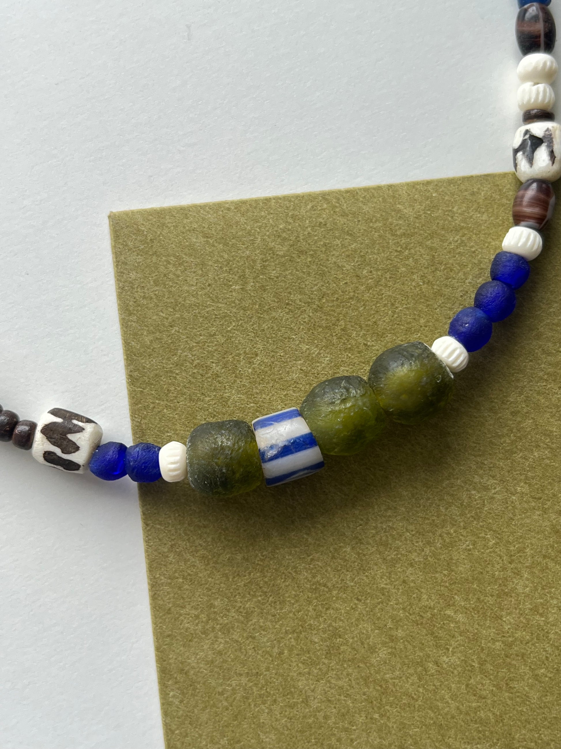 A collection of vintage sand cast glass trade beads from West Africa and other beads made from recycled glass, coconut shells and bone, strung on a strong nylon coated stainless steel wire, finished with sterling silver hardware.