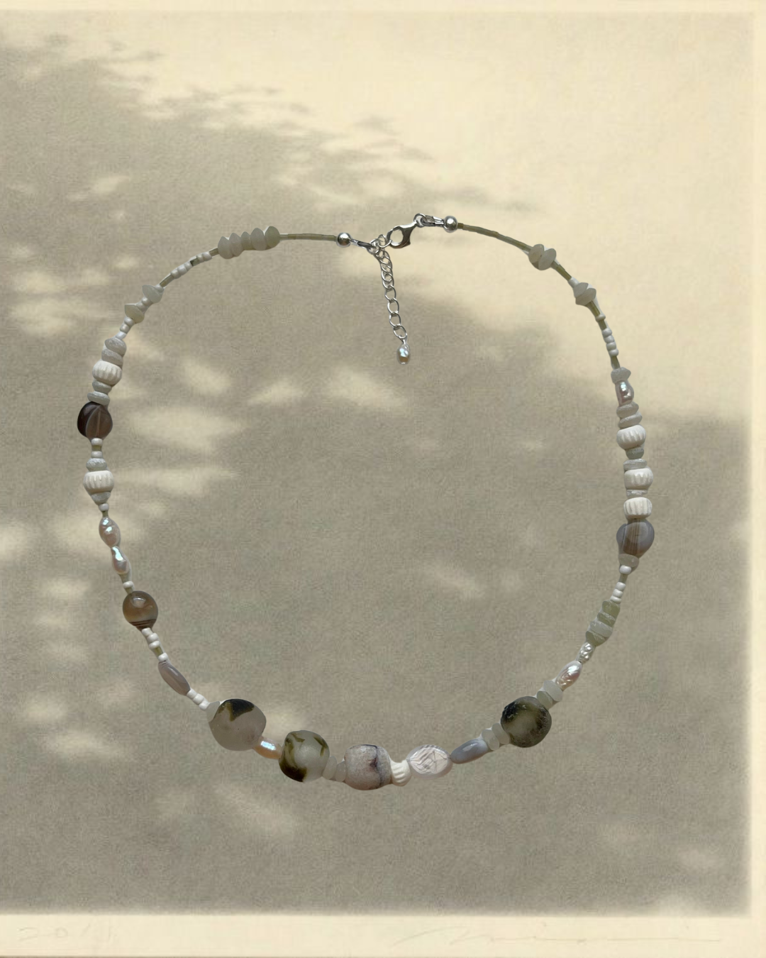 A collection of beads made from recycled glass, bone, agate, jade and freshwater pearls, strung on a strong nylon coated stainless steel wire, finished with sterling silver hardware.