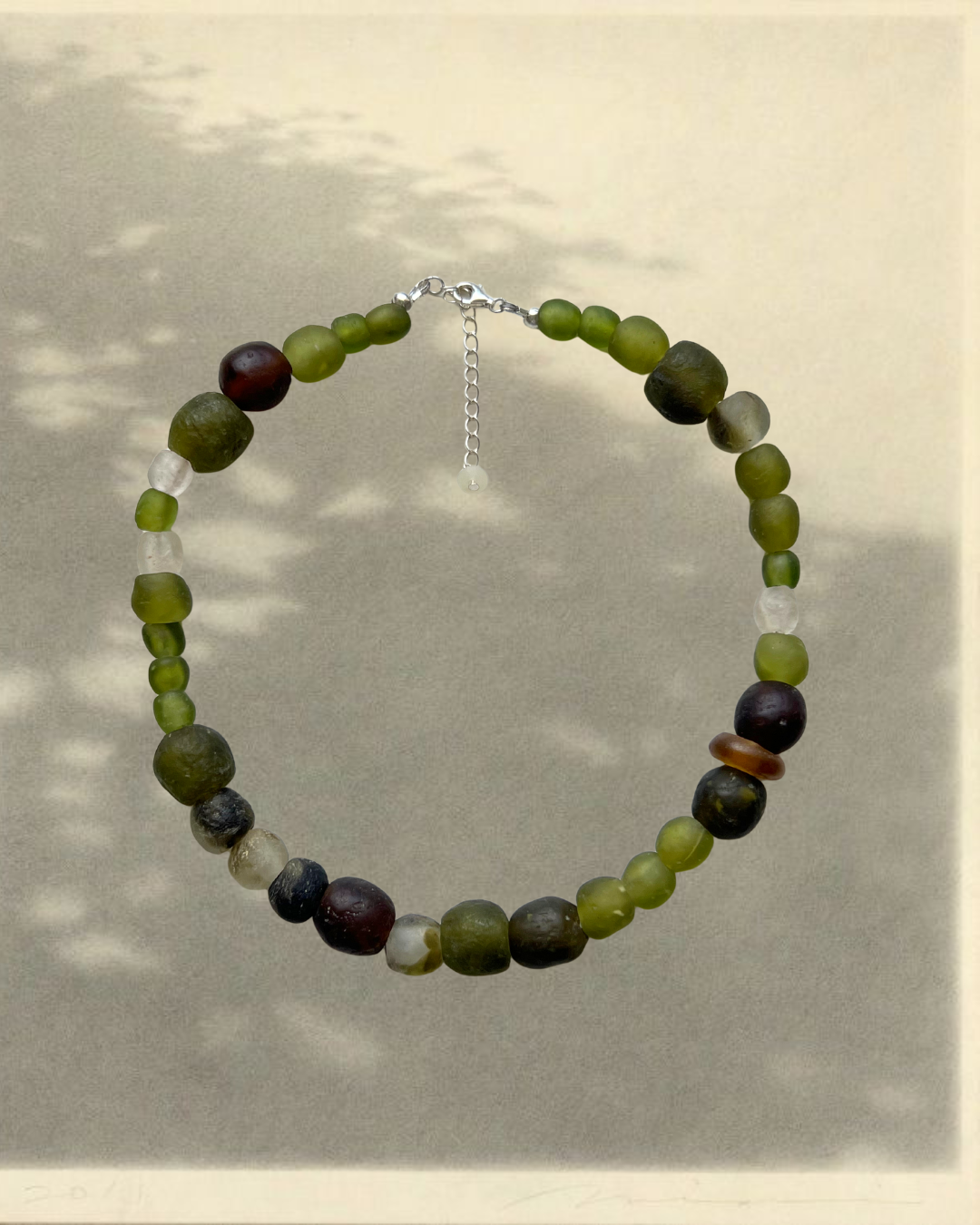 A collection of recycled glass beads, strung on a strong nylon coated stainless steel wire, finished with sterling silver hardware.