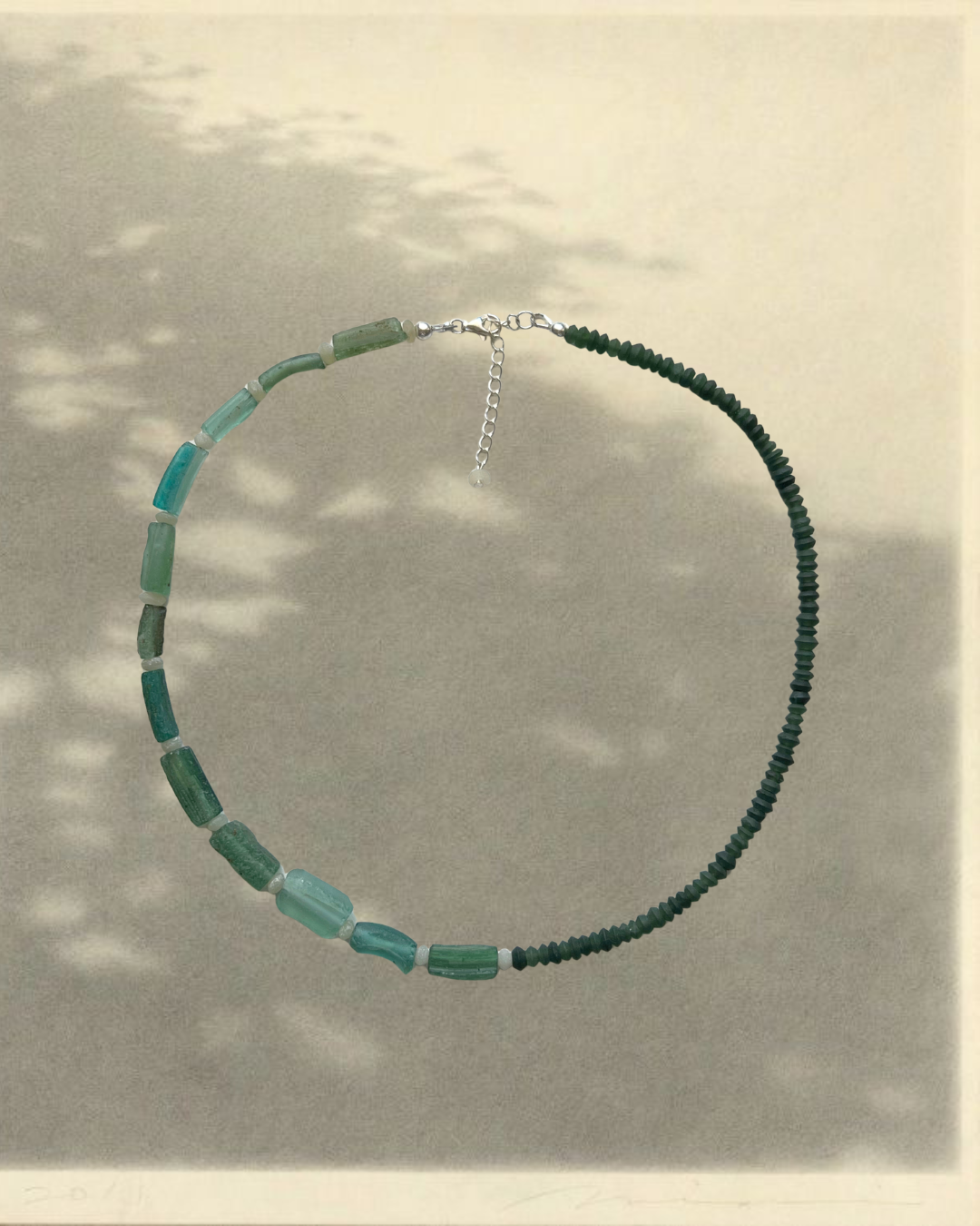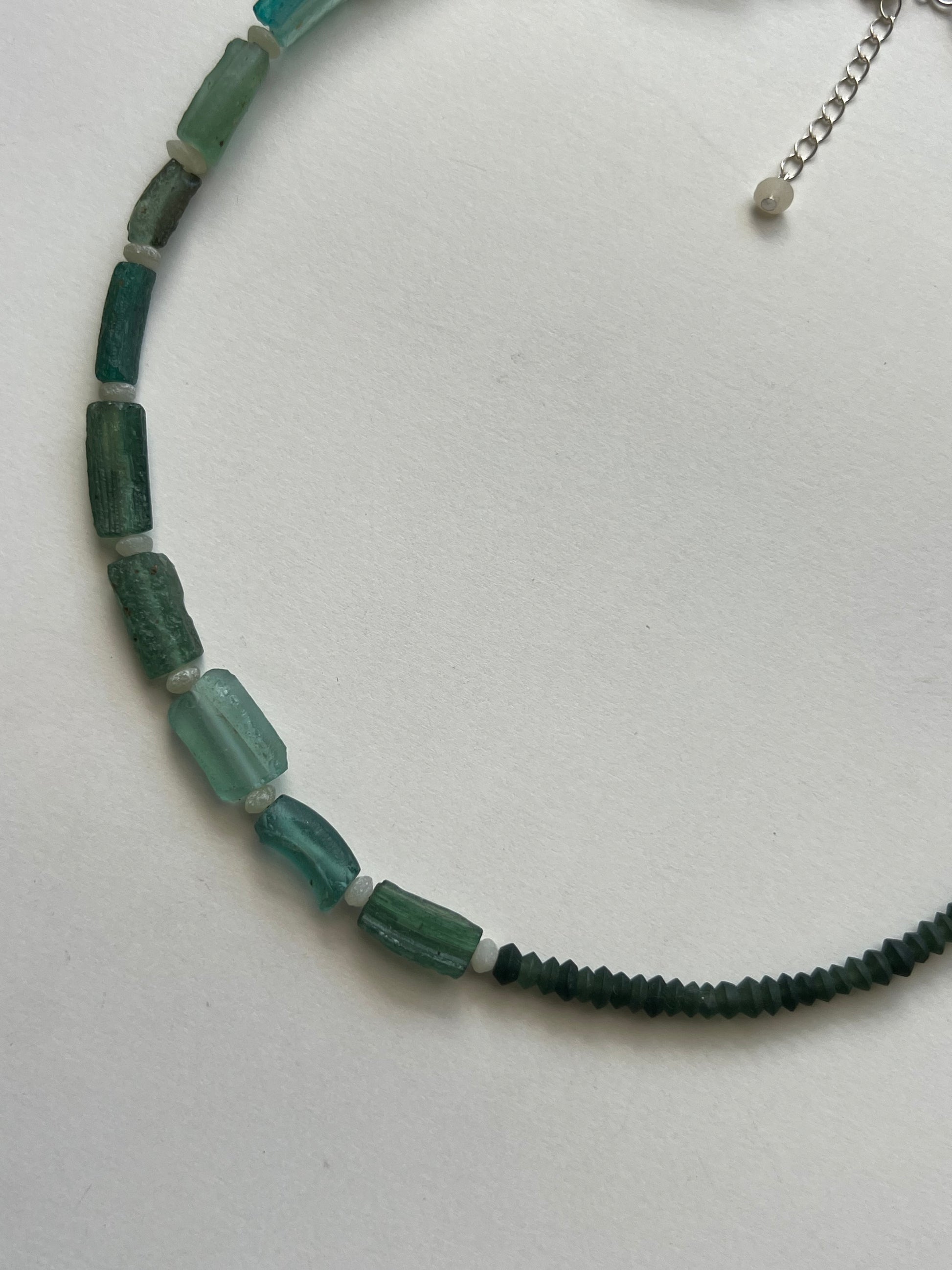 A collection of roman glass and jade beads, strung on a strong nylon coated stainless steel wire, finished with sterling silver hardware.
