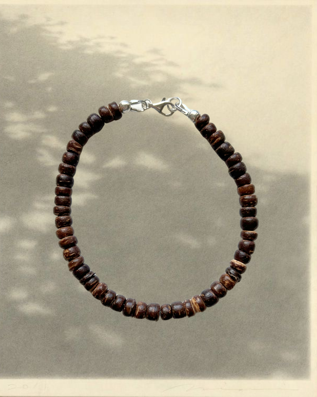 A collection of coconut shell beads, strung on a strong nylon coated stainless steel wire, finished with sterling silver hardware.