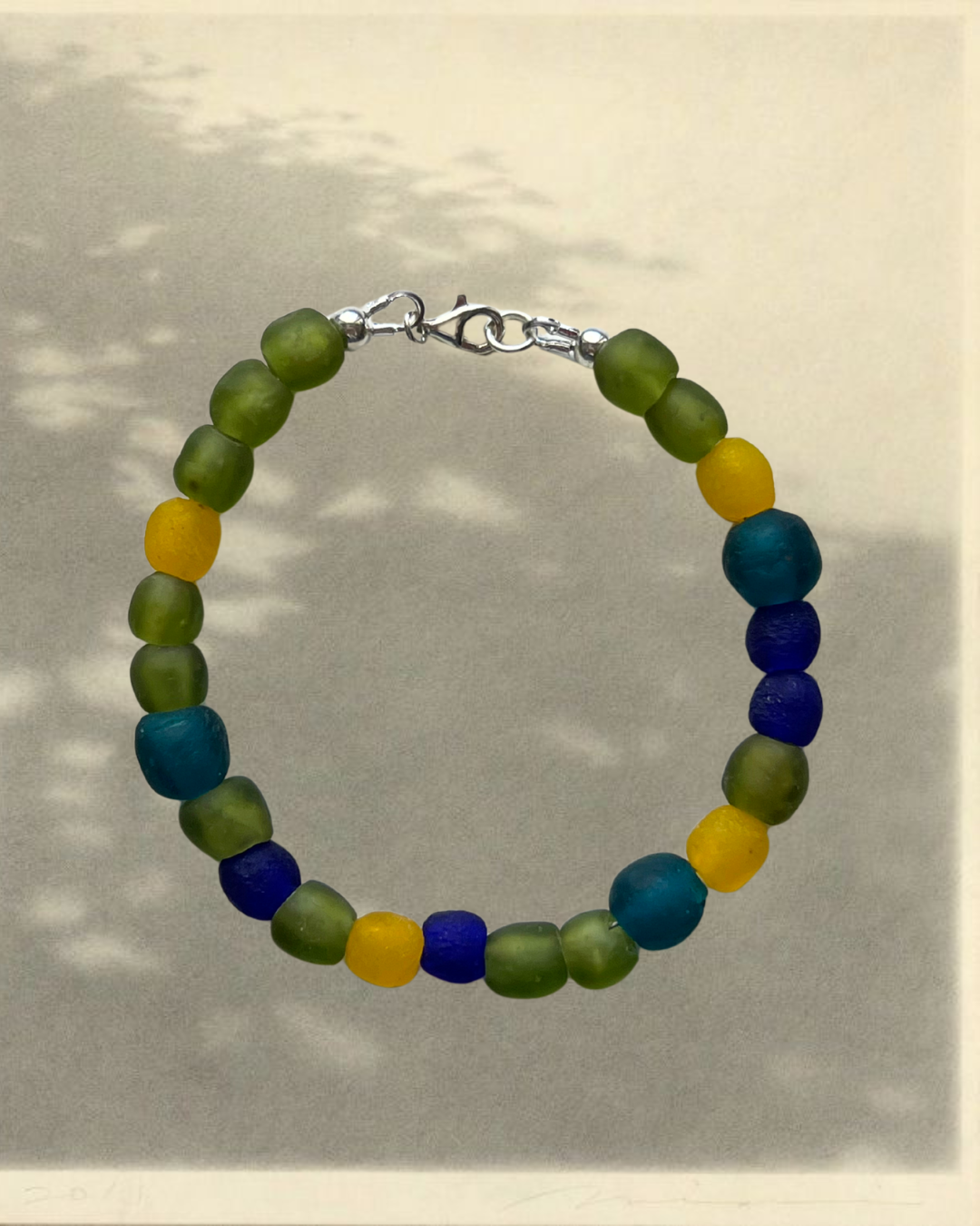 A collection of recycled glass beads, strung on a strong nylon coated stainless steel wire, finished with sterling silver hardware.