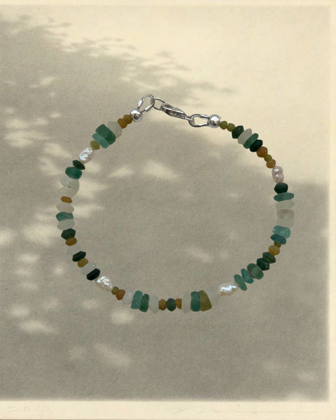 A collection of fresh water pearls and recycled glass beads, strung on a strong nylon coated stainless steel wire, finished with sterling silver hardware.