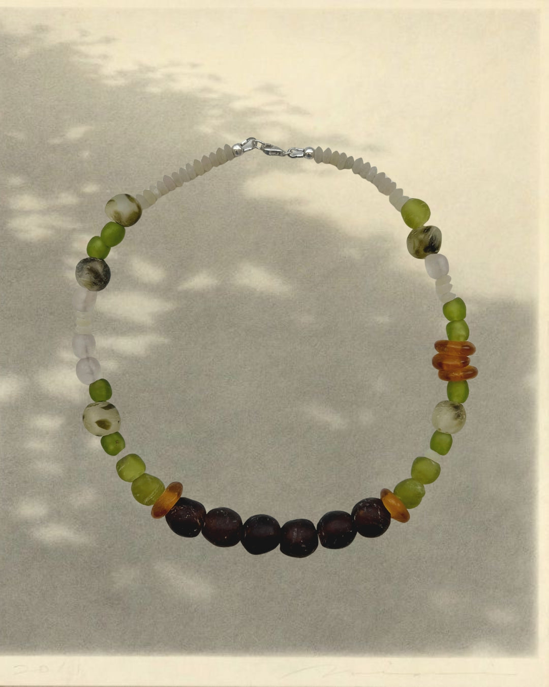A collection of recycled glass beads strung on a strong nylon coated stainless steel wire, finished with sterling silver hardware.