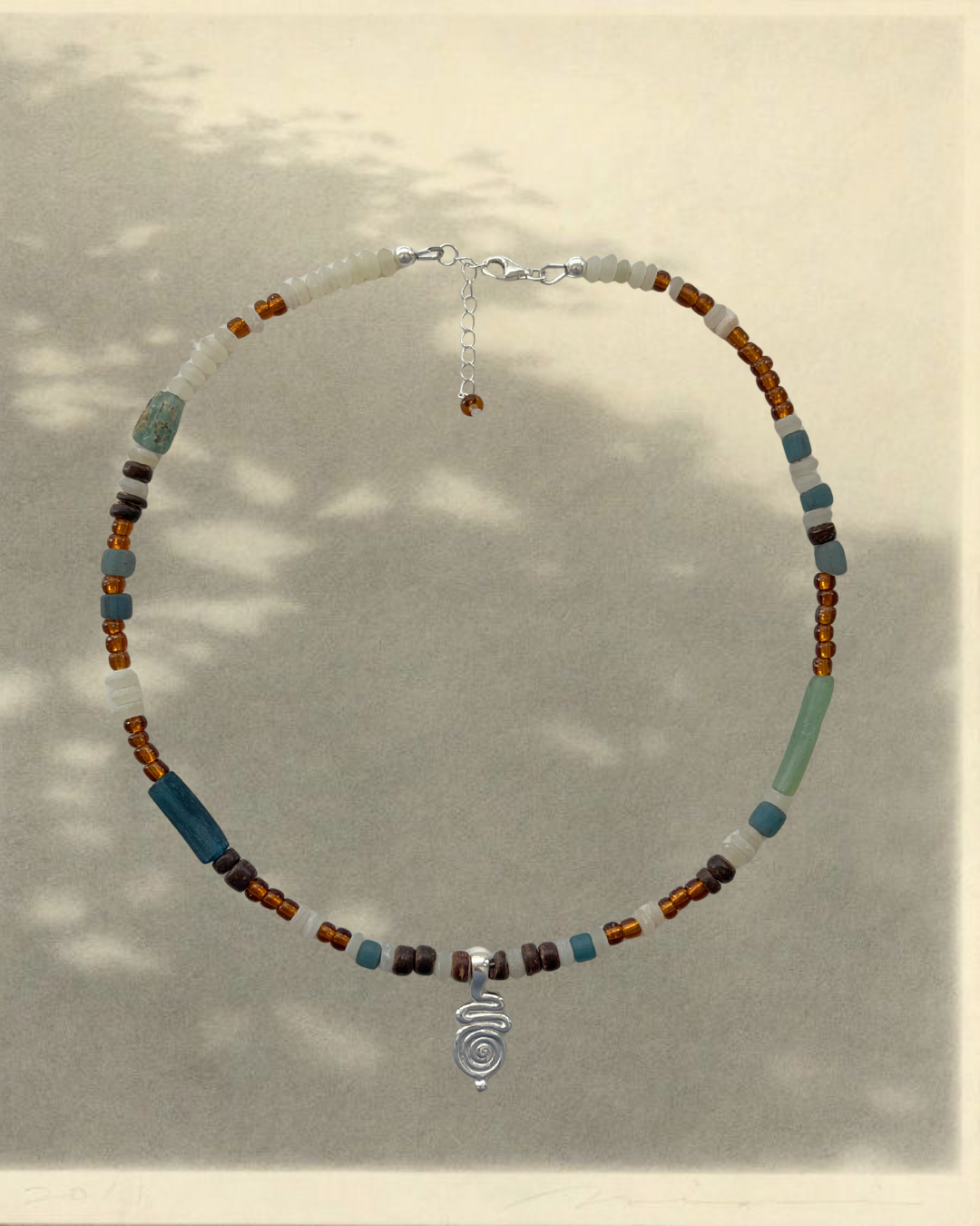 A sterling silver TIDAL pendant surrounded by a collection of beads made from jade, recycled glass, coconut shell and fresh water pearls, strung on a strong nylon coated stainless steel wire, finished with sterling silver hardware.