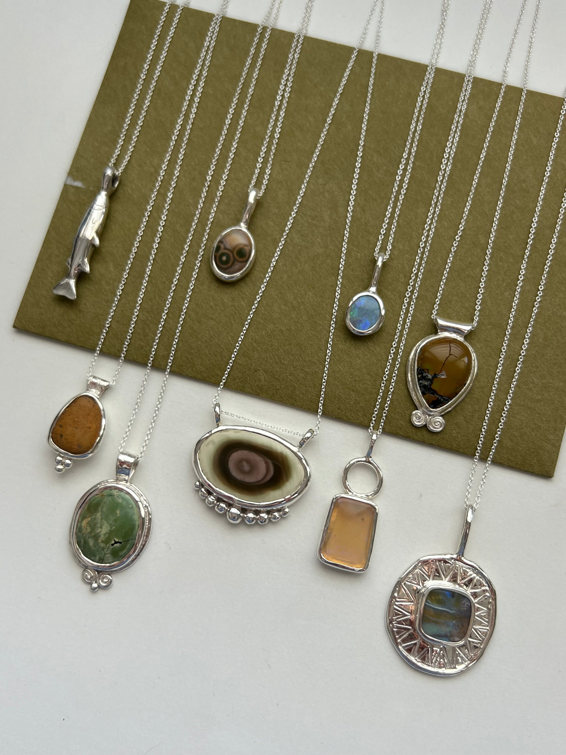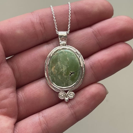 Turquoise stone set in an hand formed, solid sterling silver pendant on a dainty 42cm sterling silver chain.