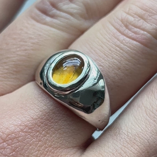 Citrine stone encased in a solid sterling silver signet ring.
