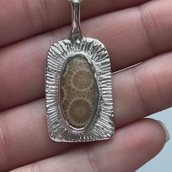Fossilised coral stone encased in a hand formed, solid sterling silver pendant on a dainty 45cm sterling silver chain.