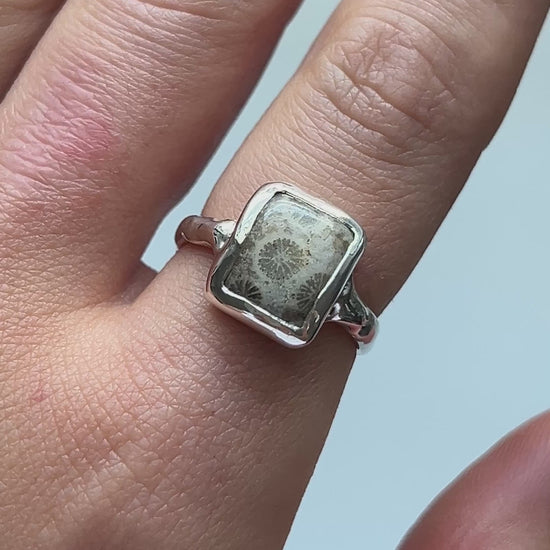 Fossilised coral stone encased in a simple hand formed, solid sterling silver ring.