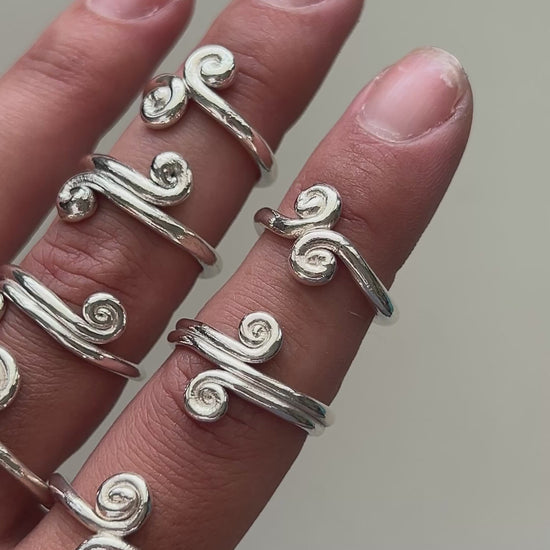 Solid sterling silver rings with different swirl shapes and lots of organic textures.
