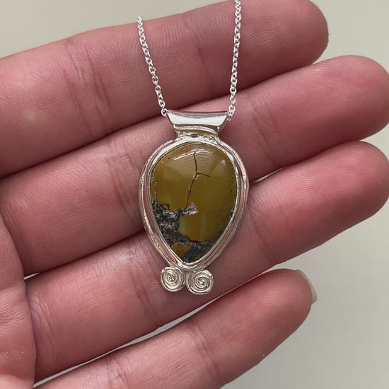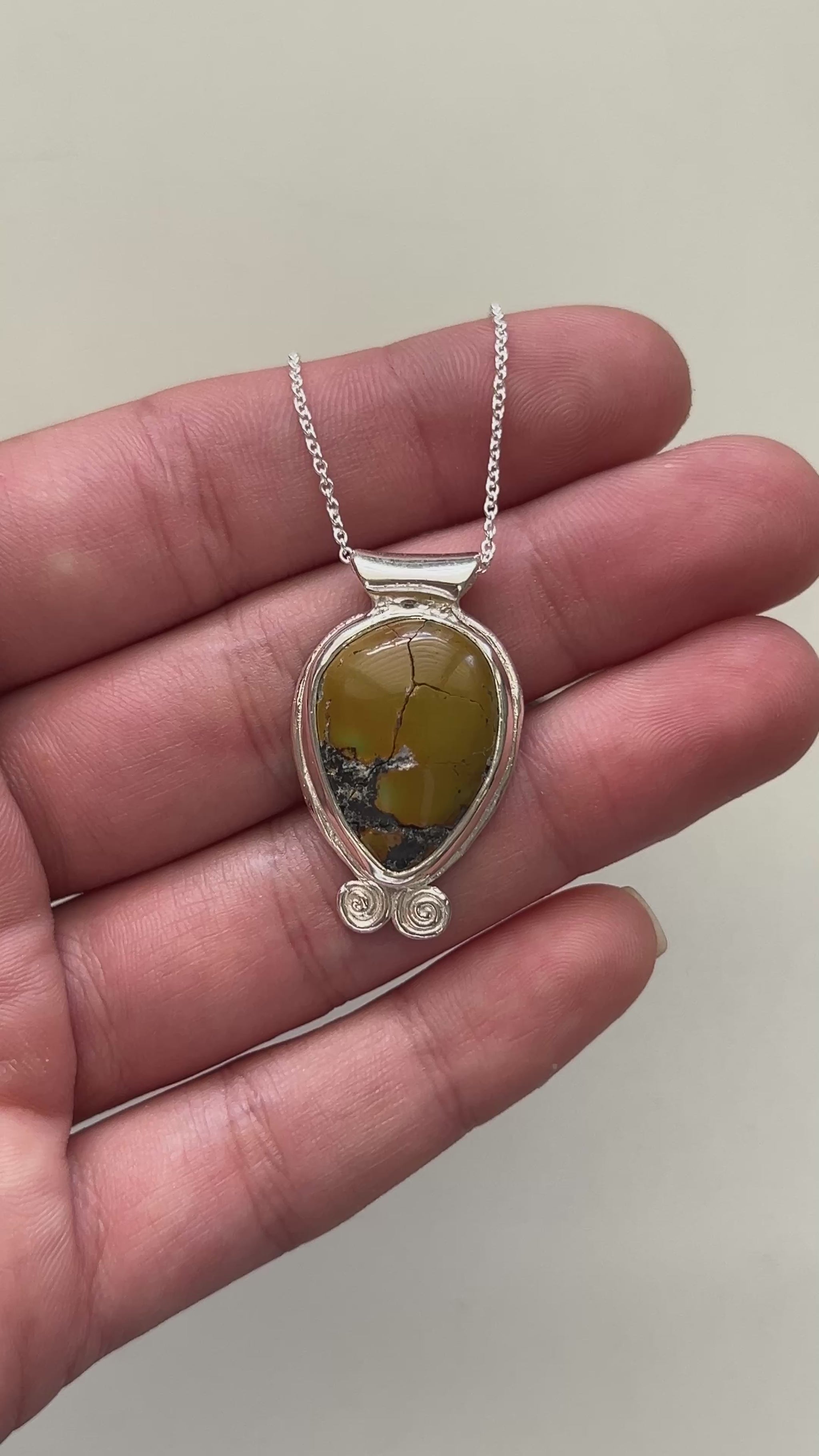 Rare Tibetan turquoise, set in a hand formed, solid sterling silver pendant on a dainty 42cm sterling silver chain.