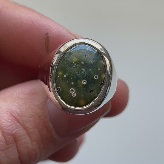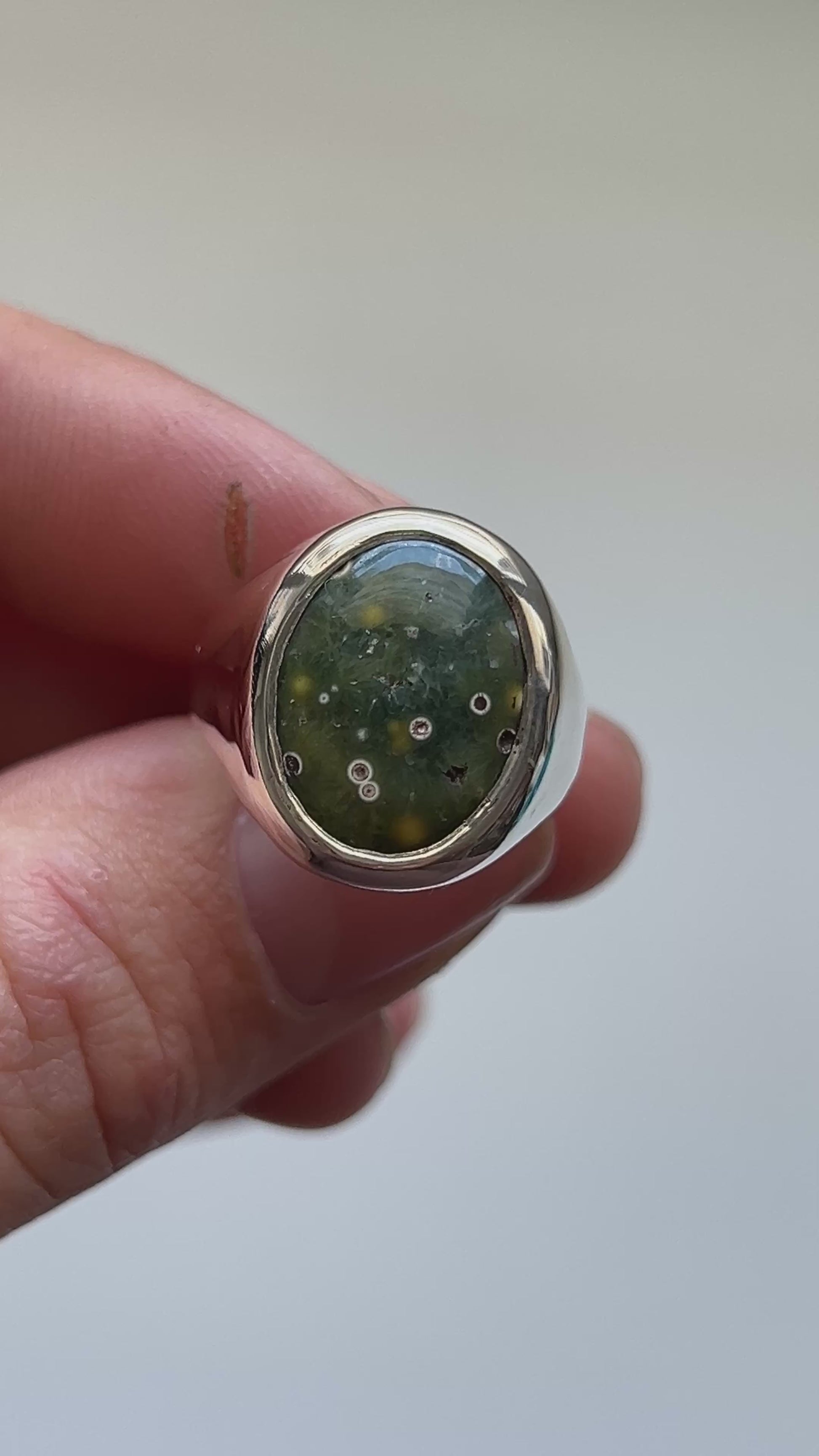 Forest green ocean jasper with flecks of yellow & white, encased in a solid sterling silver signet ring.
