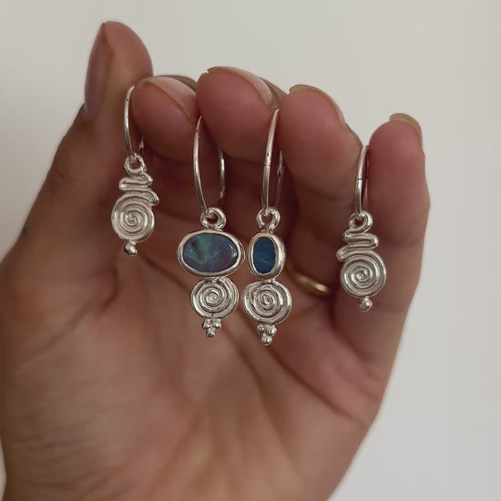 Asymmetric Australian boulder opals, encased in hand formed, solid sterling silver charms on 16mm sterling silver sleeper hoops.