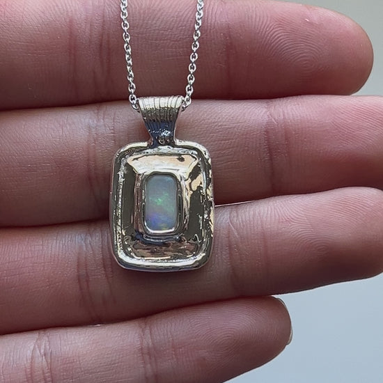 Milky boulder opal with colourful flashes, encased in a hand formed, solid sterling silver pendant on a dainty 42cm sterling silver chain.