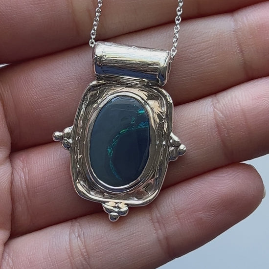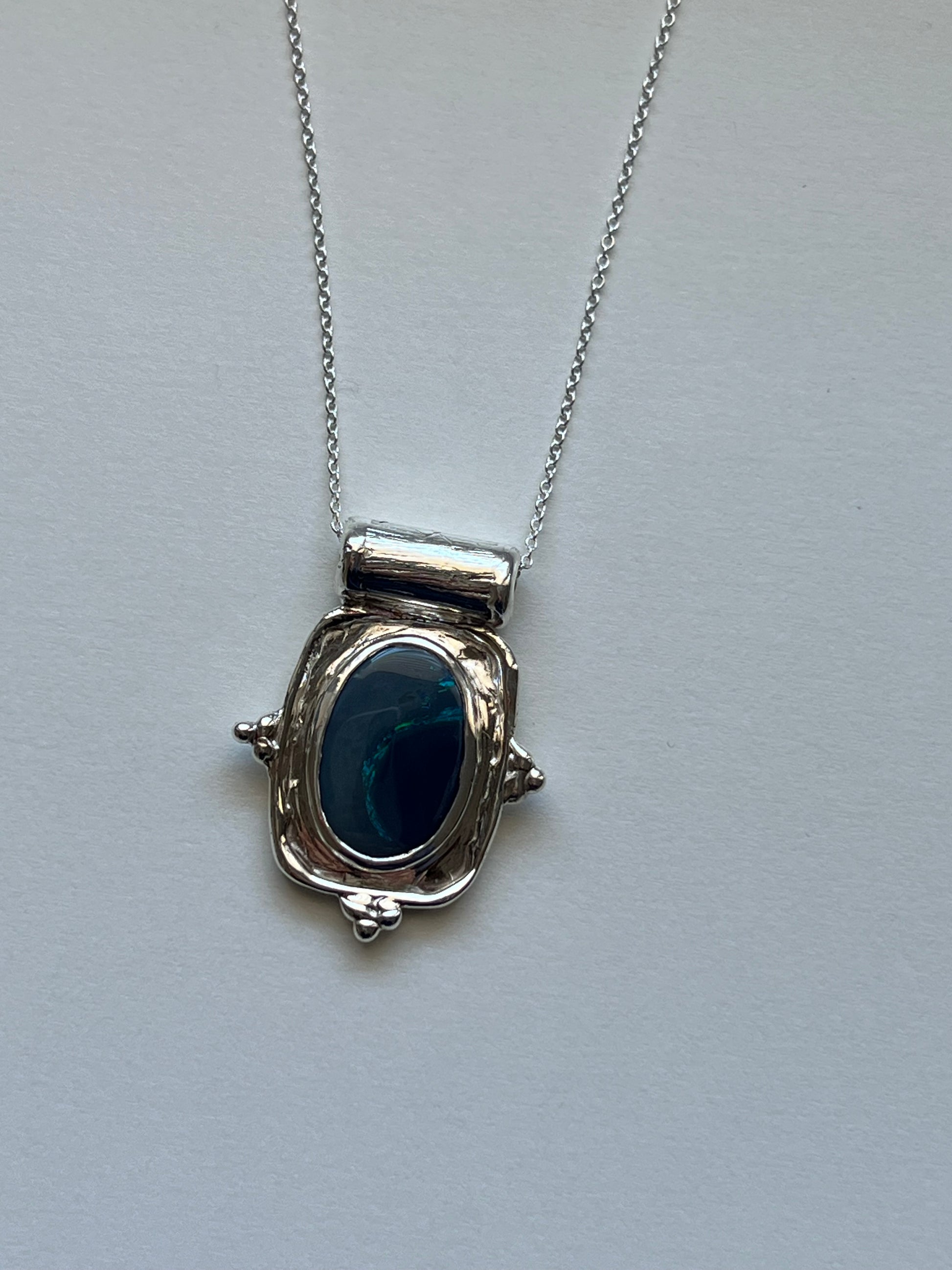 Deep blue lightning ridge opal with a flashy blue/green seam, encased in a hand formed, solid sterling silver pendant on a dainty 42cm sterling silver chain.