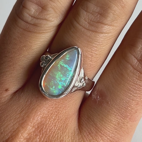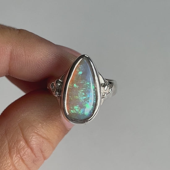 Coober Pedy crystal opal encased in a hand formed, solid sterling ring.