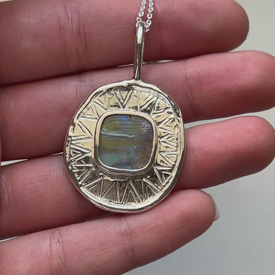 Colourful boulder opal, set in a hand formed, solid sterling silver pendant on a dainty 42cm sterling silver chain.