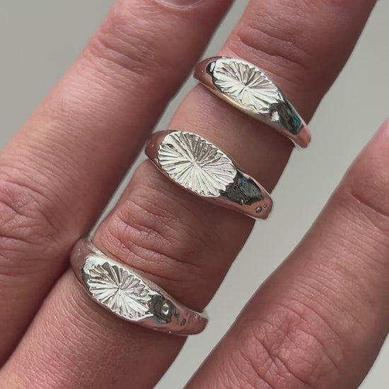 Solid sterling silver signet ring with an engraved starburst design and lots of organic textures.