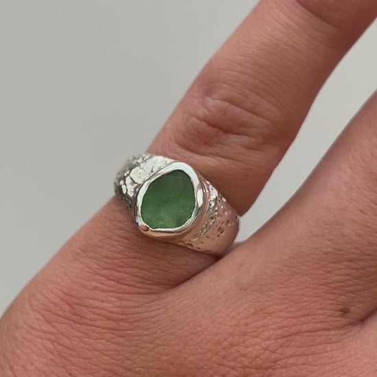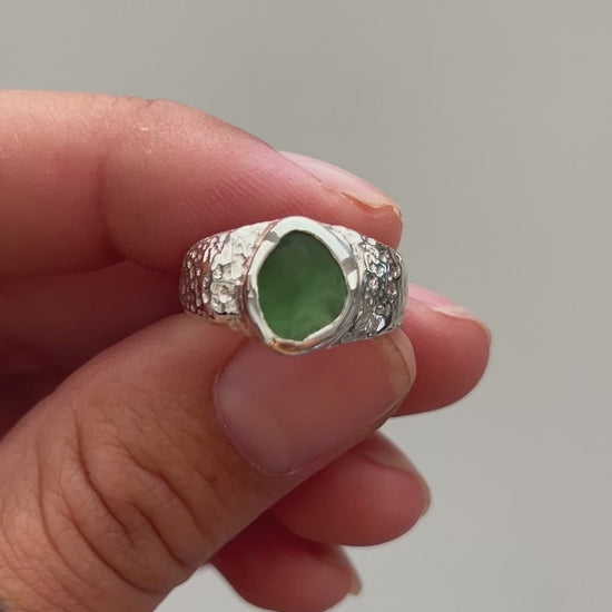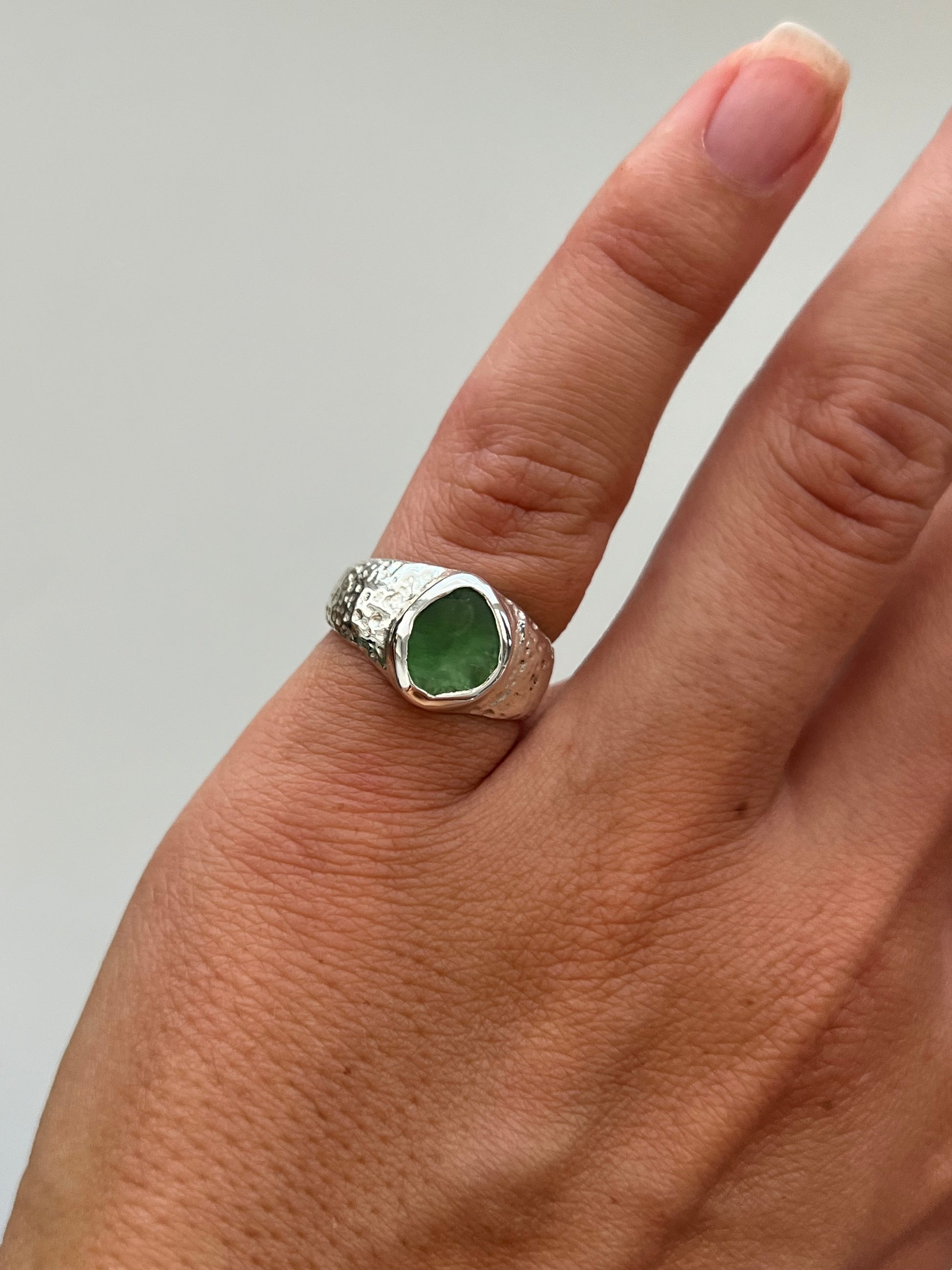 Green sea glass, picked up on my travels around Australia, encased in a solid sterling silver ring with a wide textured band.